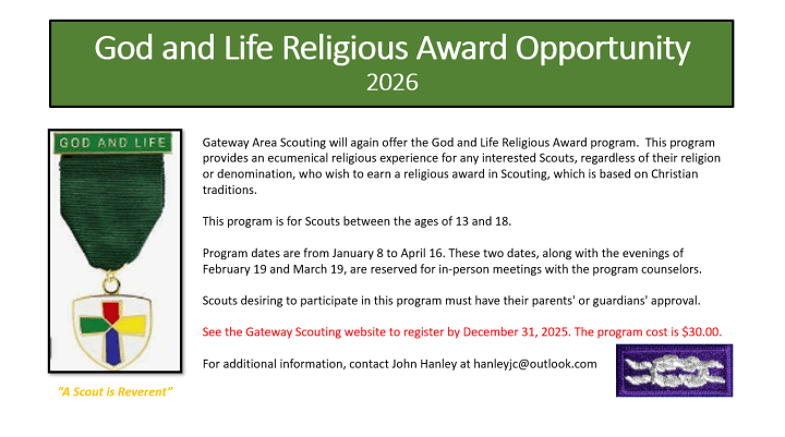 Gateway Area Scouting will again offer the God and Life Religious Award program. This program provides an ecumenical religious experience for any interested Scouts, regardless of their religion or denomination, who wish to earn a religious award in Scouting based on Christian traditions.